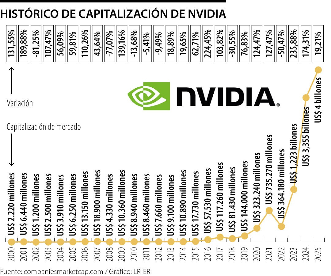 La reunión de Huang con Trump también se produce un día después de que Nvidia se convirtiera en la primera compañía en superar los US$4 billones en capitalización de mercado, con los inversores señalando un entusiasmo continuo por un auge de la inteligencia artificial que ha impulsado las acciones en todo el sector tecnológico.