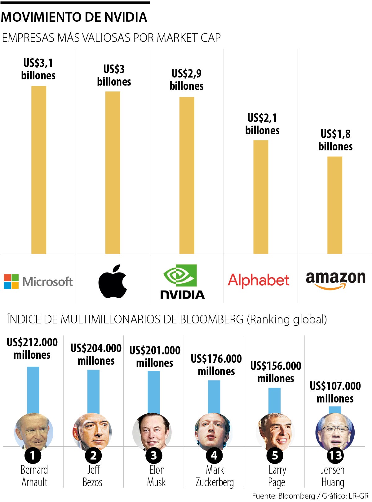 El repunte de las acciones de la empresa de semiconductores mantiene sus niveles más altos en la historia y de hecho Huang se metió entre los 15 hombres más ricos del mundo, llegó a la casilla 13 en el índice de multimillonarios de Bloomberg al club de los centibillonarios con US$107.000 millones. El emprendedor taiwanés incluso aparece superando a figuras como el magnate indio Gautam Adani o el empresario mexicano Carlos Slim.