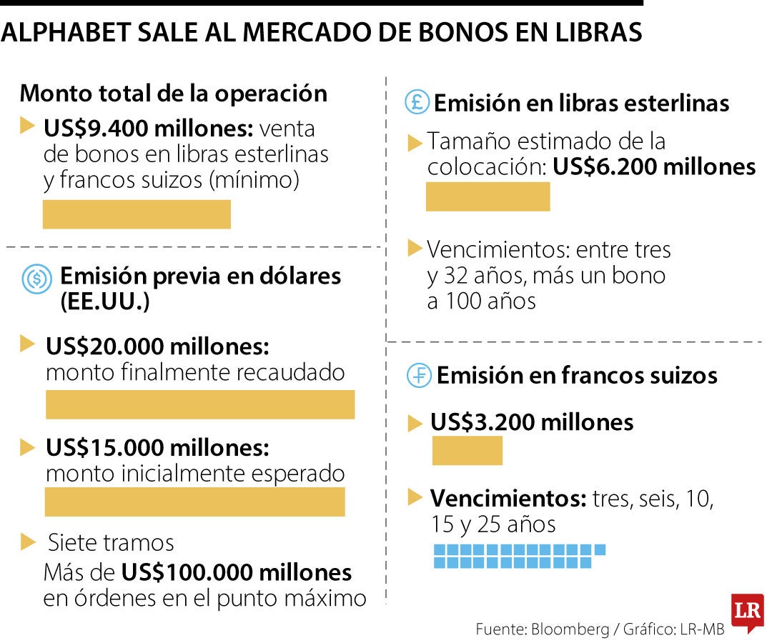 Alphabet recaudó US$20.000 millones en una venta de deuda en dólares dividida en siete tramos, superando las expectativas iniciales de una operación por US$15.000 millones