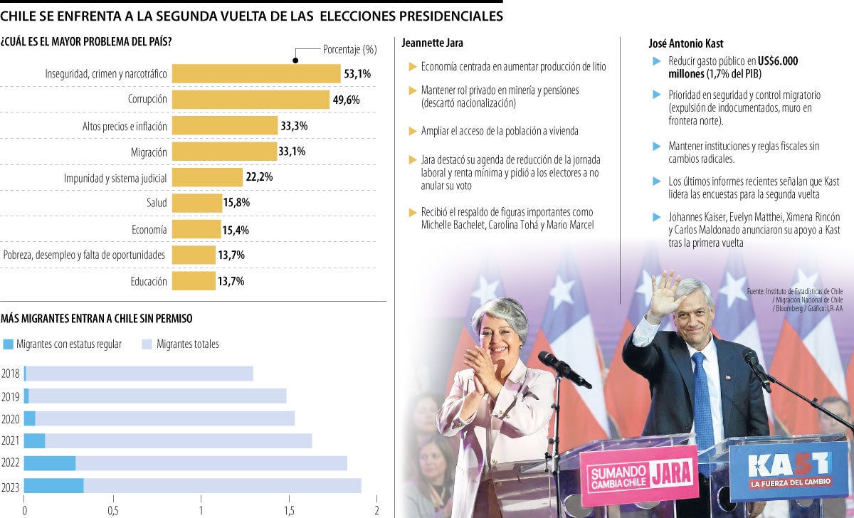 Por otro lado está José Antonio Kast, quien quedó segundo en la primera vuelta, pero llega al balotaje como favorito en las encuestas, impulsado por el respaldo de los votantes de otros candidatos de derecha que quedaron fuera de la carrera. Su ascenso refleja un cambio de clima político respecto a 2021, cuando perdió frente a Boric en medio de protestas sociales y expectativas de transformación constitucional.