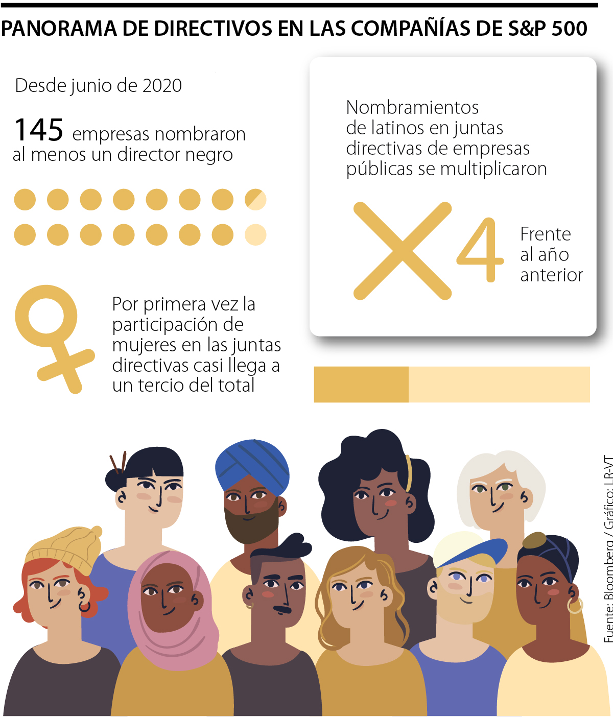 Desde junio pasado, 145 compañías del S&P 500 han agregado al menos un director negro, un ritmo “rápido” en comparación con años anteriores, según el reclutador Russell Reynolds Associates. Los nombramientos de latinos en juntas directivas en empresas públicas se cuadriplicaron con respecto a hace un año, y las mujeres, por primera vez, ocupan casi un tercio de todos los puestos en el S&P 500. Solo una importante oferta pública inicial en Estados Unidos debutó con una junta exclusivamente masculina el año pasado.