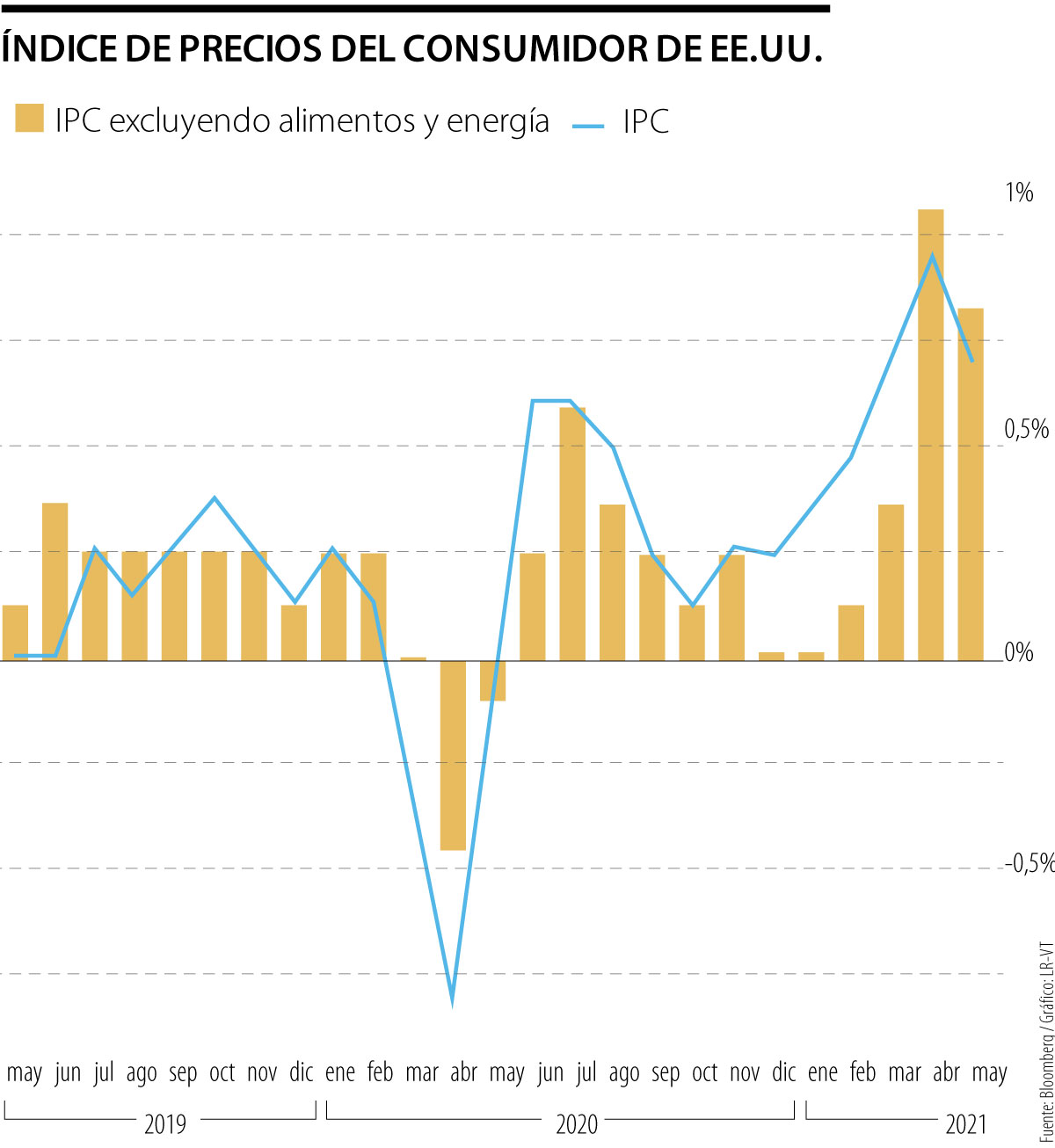 El Índice de Precios al Consumidor subió 0,6%, el segundo mayor avance en más de una década. Aunque distorsionado por la pandemia, el IPC saltó 5% respecto al año anterior, la mayor ganancia anual desde agosto de 2008, según datos del Departamento de Trabajo.