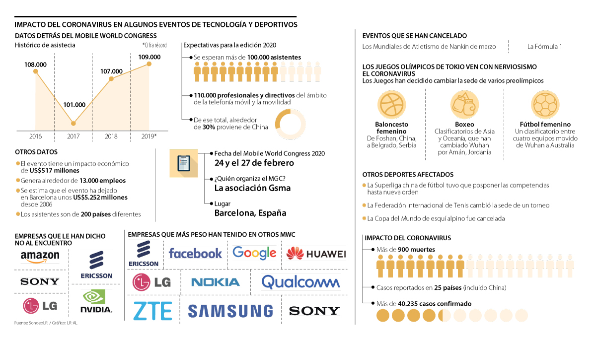 El impacto del coronavirus no solo se ha sentido en los mercados bursátiles de todo el mundo, sino que también ha impactado la agenda de diferentes eventos deportivos como los Mundiales de Atletismo de Nankín de marzo y la Fórmula 1. Además, tiene en jaque al Mobile World Congress (MWC) que se llevará a cabo en Barcelona, España, del 24 al 27 de febrero.