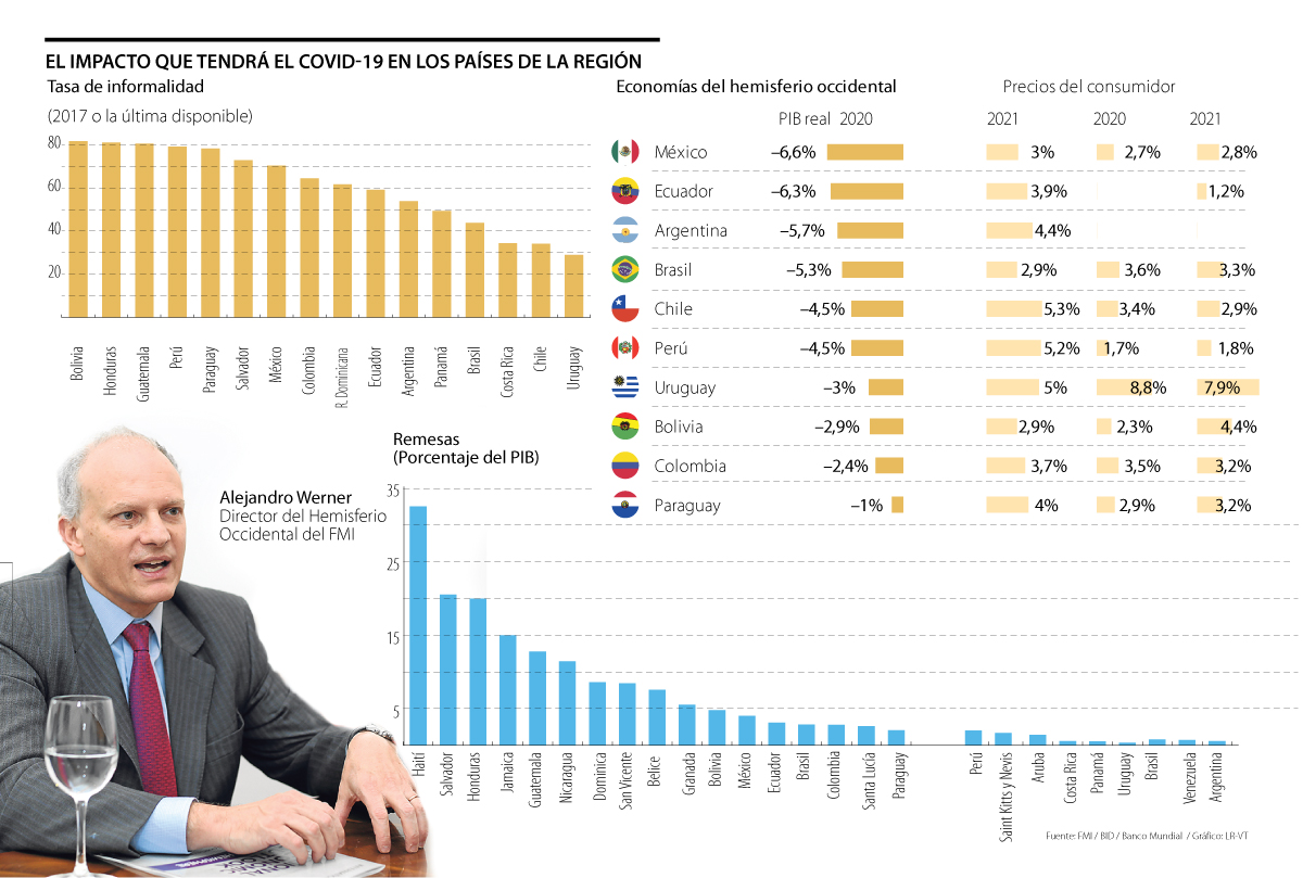 El Fondo Monetario Internacional, FMI, presentó sus nuevas proyecciones de crecimiento mundial vaticinando una contracción de 3% en el mundo y de 5,2% para la región, todo por causa del Covid-19. Alejandro Werner, director del Departamento del Hemisferio Occidental del FMI, dice directamente que "el impacto económico directo e indirecto en América Latina será significativo".