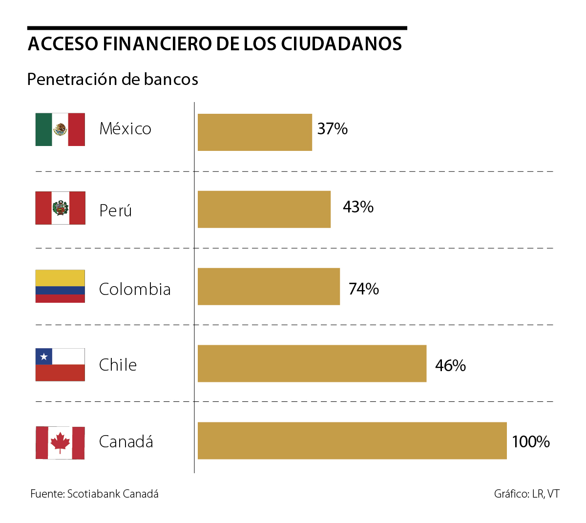 Canadá hoy tiene una penetración bancaria del 100%, mientras que el promedio entre los países de la Alianza del Pacífico llega al 50%, siendo México el de menor desempeño (37%) y Chile el de mejor comportamiento (74%). Dichas cifras suponen un reto y una oportunidad de negocio para las entidades financieras que decidan participar en este mercado de 225 millones de habitantes.