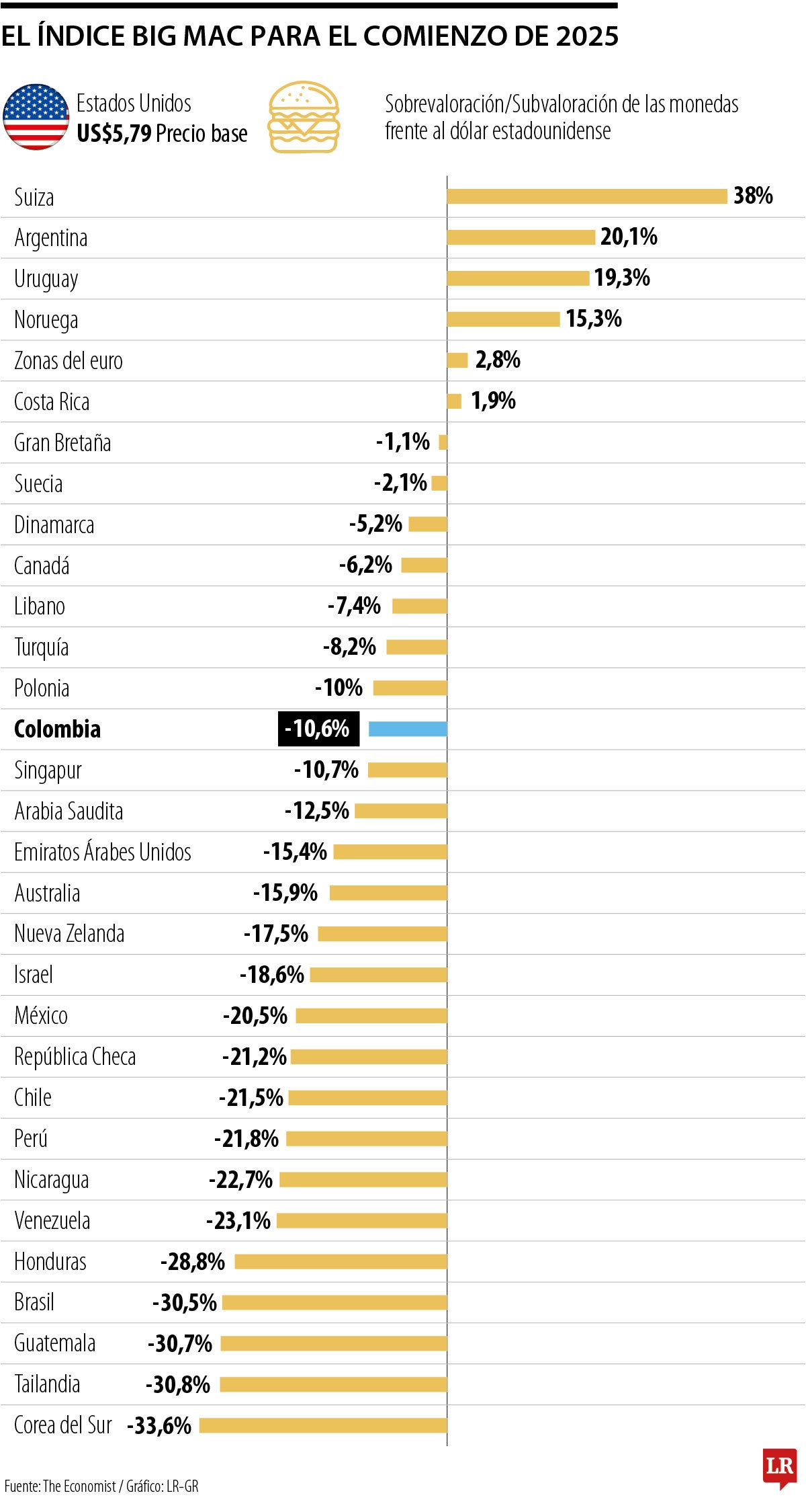 Como se dijo, Colombia tiene la octava Big Mac más barata entre los países con las monedas más devaluadas, pues la hamburguesa cuesta 10,6% menos del precio estándar en Estados Unidos. Para el comprador global, la hamburguesa en Colombia resulta siendo más barata que los otros pares, pero para el colombiano que quiera comprarla, deberá pagar más pesos de su moneda local para pagar una Big Mac en dólares.