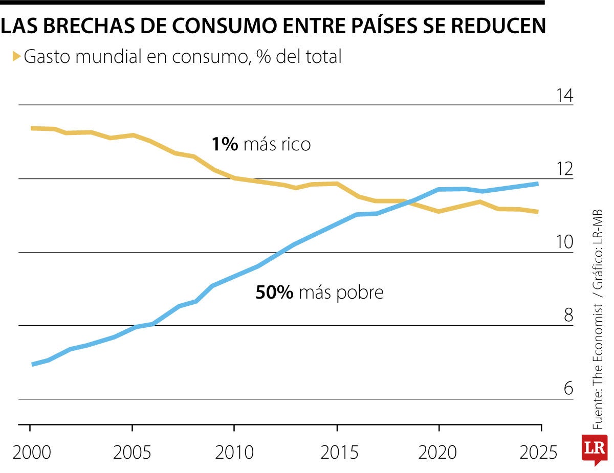 Dicho de otra manera, el consumo en muchas economías en desarrollo ha crecido a un ritmo más acelerado que en las economías más ricas, reduciendo así la brecha global. Esto no significa que los países ricos estén retrocediendo, sino que los países de ingresos bajos y medios han logrado avanzar más rápido en términos relativos.