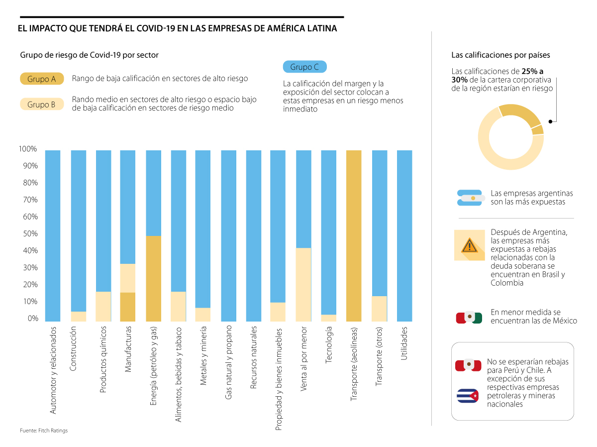 Las empresas de la región continúan en jaque, producto de las medidas que se han adoptado para contener la propagación del Covid-19. Así lo refleja un análisis de Fitch Ratings en el que se destaca que “en total, las calificaciones de 25% a 30% de la cartera corporativa que manejan en Latinoamérica estarían en riesgo debido a la vinculación gubernamental o las operaciones enfocadas en el país que tienen las compañías”.