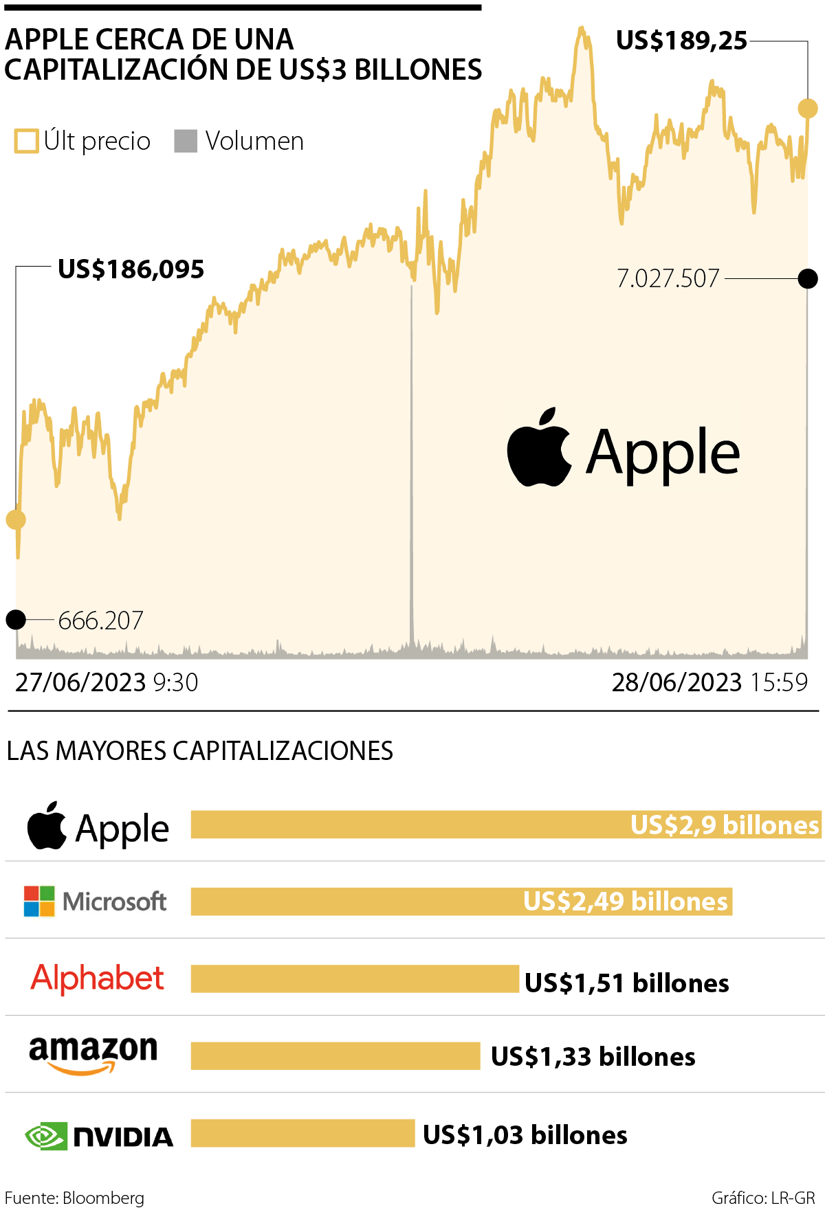 Los papeles del fabricante del iPhone llegaron a subir 1% durante la sesión, hasta US$189,90, su máximo histórico. En su última cotización sumaban casi 0,4% a US$188,81, con lo que alcanzó un valor bursátil de US$2,97 billones, según datos de Refinitiv.