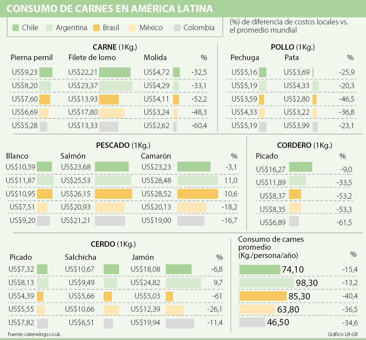 De acuerdo con el porcentaje de diferencia de precios locales respecto al promedio mundial, Brasil ocupa el segundo lugar pues es 52,2% más barato. Allí, la pierna cuesta US$7,60, el filete US$13,93 y la carne molida, US$4,11. Le sigue México (48,3%) donde los mismos productos tienen un valor de US$6,69, US$17,80 y US$3,24, respectivamente. En los últimos lugares están Argentina (33,1%) y Chile (32,5%). Lo anterior se debe a que, por ejemplo, en ambos países un kilo de filete de lomo cuesta entre US$22 y US$24 (ver gráfico).