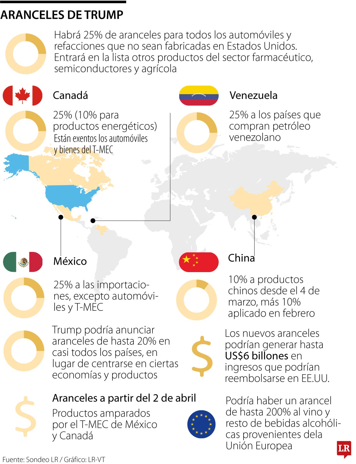 Según el Washington Post, sus asesores están considerando un plan que aumentaría los aranceles sobre productos en aproximadamente 20% en casi todos los países, en lugar de centrarse en ciertos países o productos. La administración prevé que los nuevos aranceles podrían generar más de US$6 billones en ingresos que podrían reembolsarse a los estadounidenses, según informó el periódico.