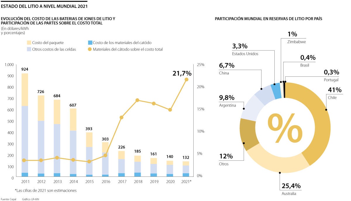 Según la Cepal, el litio es un insumo hasta ahora insustituible para la producción de las baterías de iones de litio, una tecnología clave para la descarbonización del transporte y el almacenamiento de energía generada a partir de fuentes renovables. Por tanto, tiene posibilidades de contribuir al desarrollo económico de los países mediante un impacto positivo a partir de una mayor creación de valor, es decir, del aumento del producto, de las exportaciones, del empleo y de la recaudación fiscal.