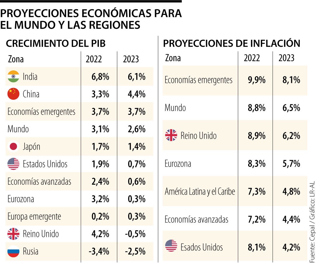 En cuanto a las economías avanzadas, la inflación sería de 7,2% este año y de 4,4% el próximo. Las economías emergentes tendrían una cifra de 9,9% y 8,1%, respectivamente; Estados Unidos, 8,1% y 4,2%, respectivamente; la euro zona 8,3% y 5,7%, respectivamente; Reino Unido 8,9% y 6,2%, respectivamente; y América Latina y el Caribe 7,3% y 4,8%, respectivamente.