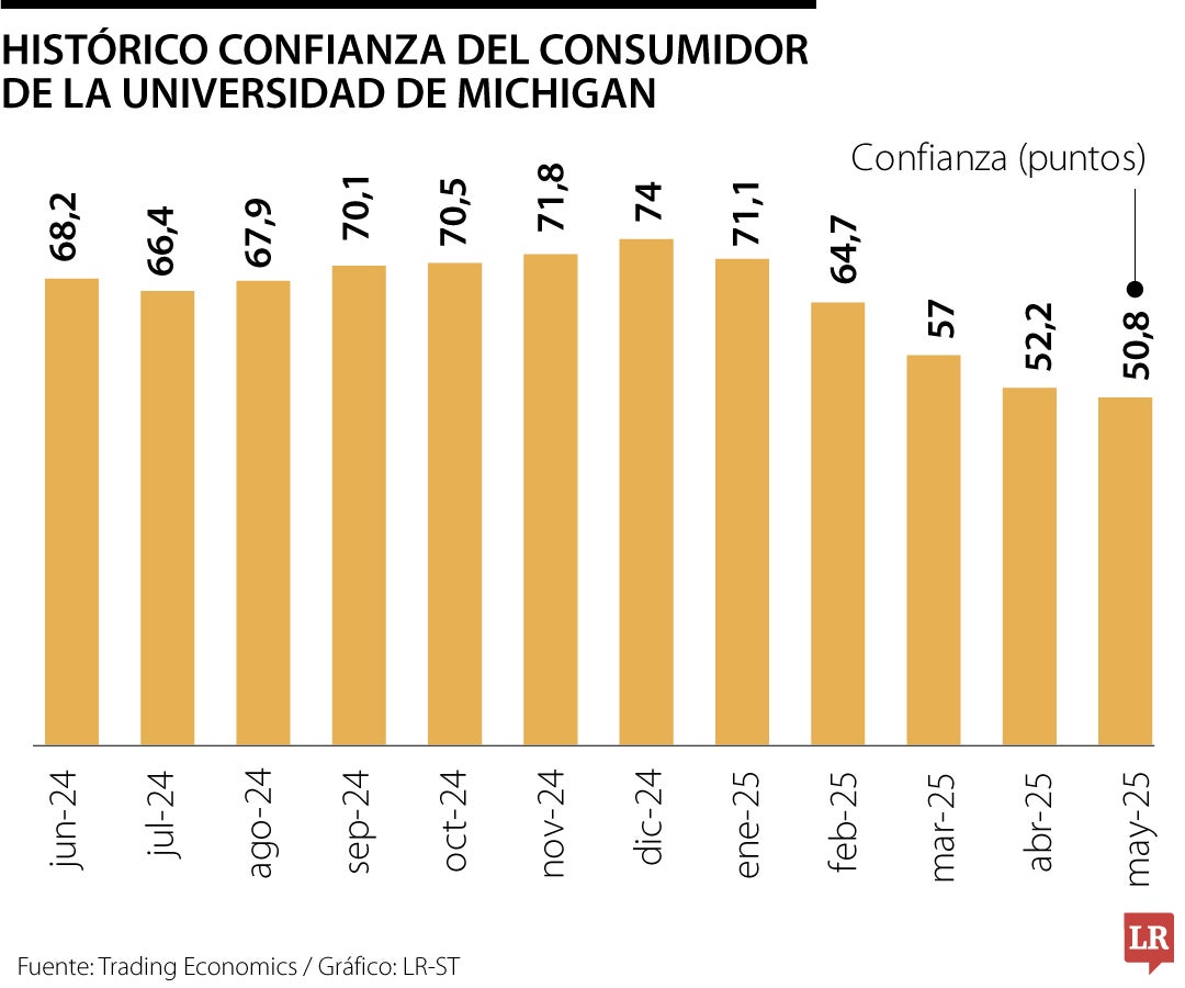 La Encuesta a los Consumidores de la Universidad de Michigan mostró que su Índice de Confianza del Consumidor cayó a 50,8 este mes