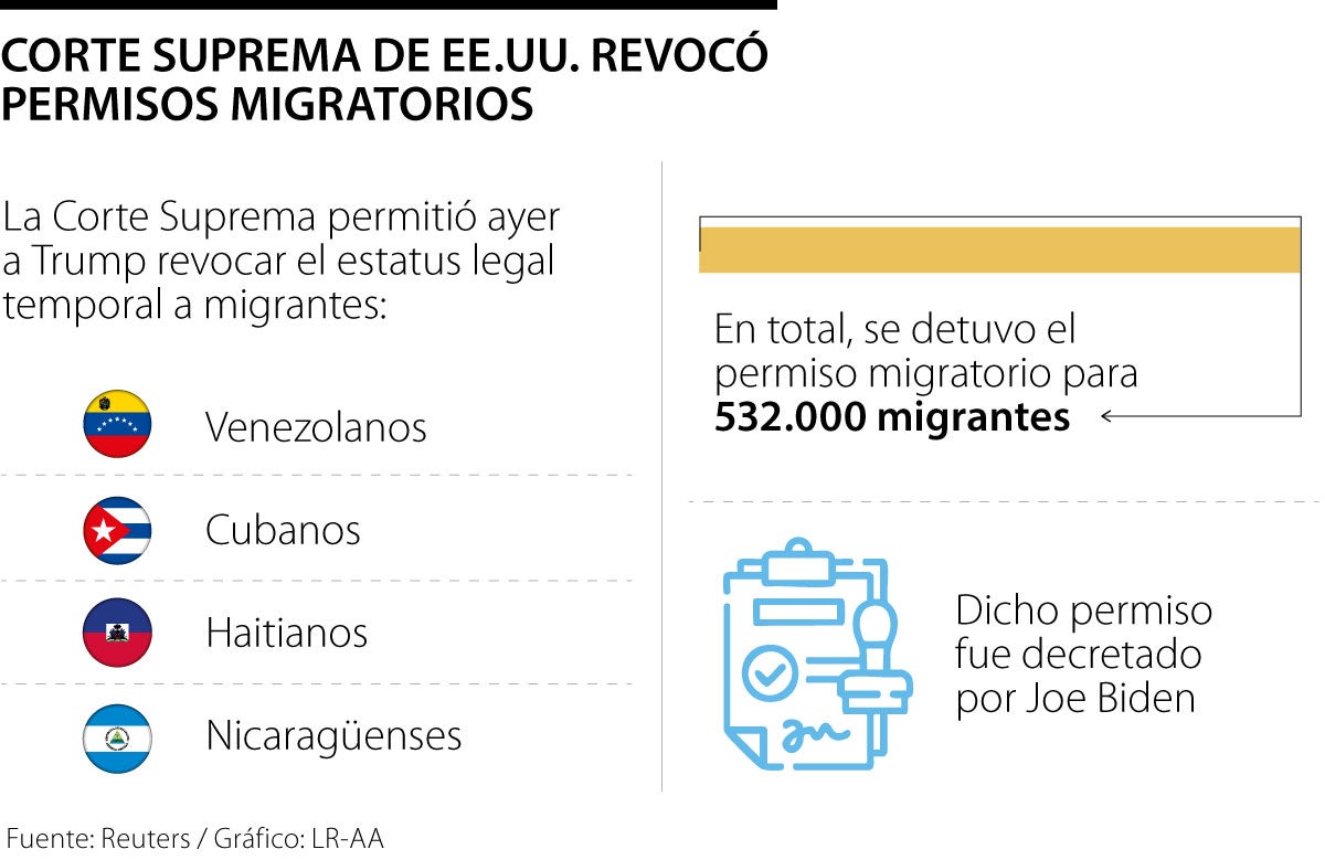 La Corte Suprema de Estados Unidos permitió el viernes al gobierno del presidente Donald Trump revocar el estatus legal temporal de cientos de miles de migrantes venezolanos, cubanos, haitianos y nicaragüenses que viven en Estados Unidos.