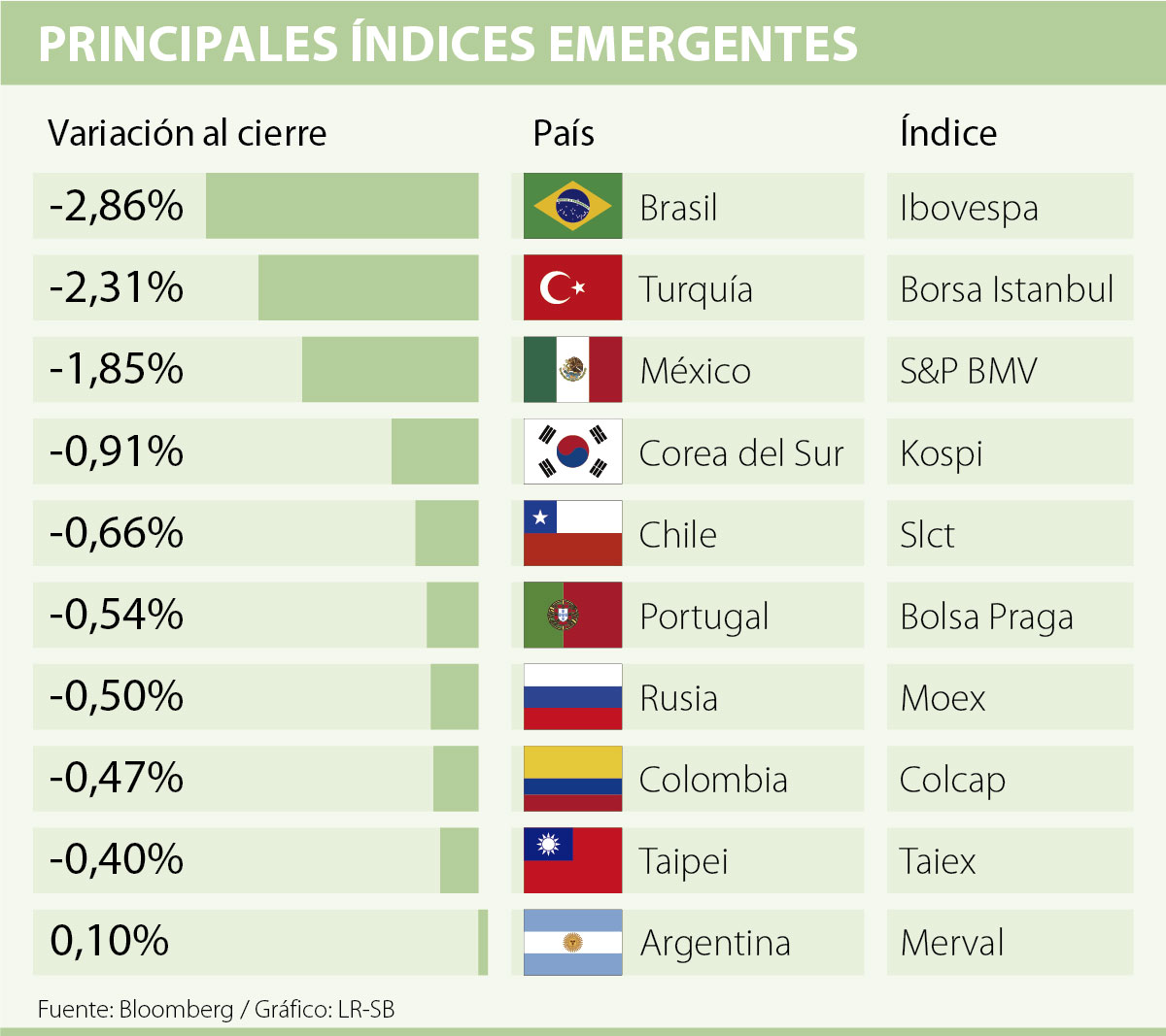 A nivel regional varios de los mercados emergentes cayeron. Es el caso del índice Ibovespa de Brasil que llegó a perder -2,86%, así mismo se vio impactada la bolsa mexicana que cayó -1,85%, logrando además su tercera jornada consecutiva de pérdidas. El único de los principales latinos emergentes que no tuvo números rojos en la jornada fue el mercado argentino que al cierre alcanzó 0,10%.