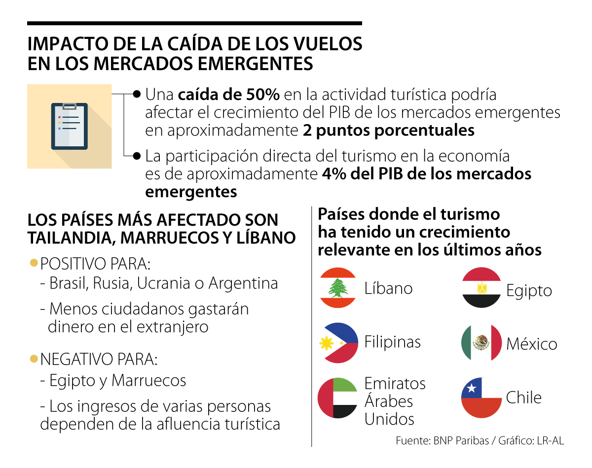 El mal momento que atraviesa el sector aéreo le pasará factura a las economías emergentes. Según BNP Paribas, si se registrara una caída de 50% en la actividad turística, se reduciría el crecimiento del PIB de estas naciones en alrededor de dos puntos porcentuales.