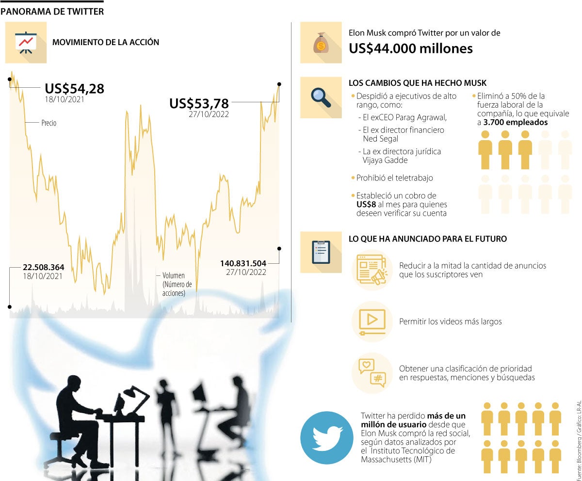 Todo comienza el 27 de octubre, cuando el multimillonario Elon Musk oficializó la compra de la red social tras más de seis meses de disputas legales entre la plataforma y el empresario para llegar a un acuerdo, por un valor final de US$44.000 millones.