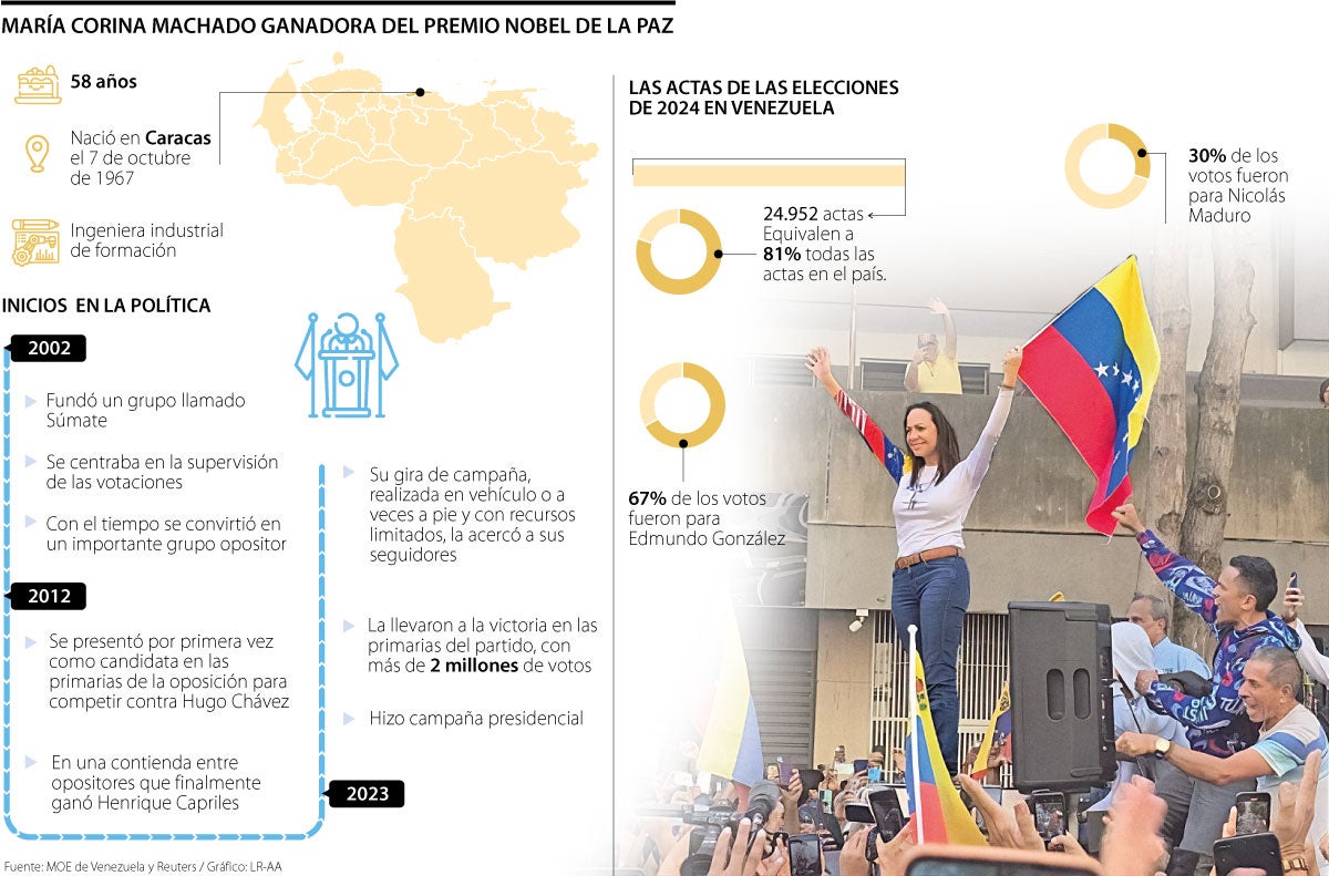 La líder opositora venezolana María Corina Machado fue galardonada con el Premio Nobel de la Paz 2025, en reconocimiento a su defensa de la democracia frente al autoritarismo en Venezuela. El Comité Noruego destacó su papel en la promoción de elecciones libres y en la construcción de un movimiento ciudadano que busca restablecer los derechos y libertades fundamentales en su país.