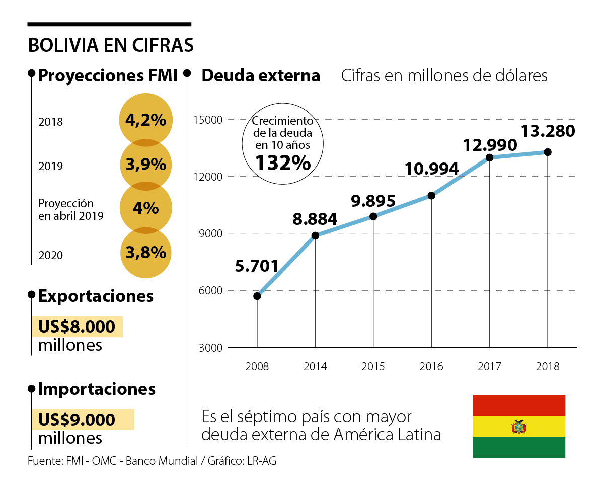 Lo que no es tan positivo es la deuda externa que ha asumido el Gobierno de Morales, pues en 10 años tuvo un incremento de 132%. En 2008 la deuda externa de Bolivia era de US$5.701 millones, mientras que a 2018 esta cifra ascendió a US$13.280 millones. Si bien no se trata de una deuda tan alta, como sí la tienen otras economías grandes de la región, esta deuda ubicó a Bolivia en la séptima casilla entre los países de América Latina con mayor deuda externa.