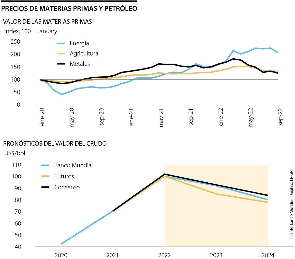 El estudio detalla que, si se controla la devaluación de las monedas y se mantienen las políticas monetarias, se proyecta que los costos de la agricultura y los metales disminuyan 5% y 15% el próximo año, antes que se logren estabilizar en 2024. Además, se prevé que los precios de la energía bajen 11% en 2023 y 12% en 2024.