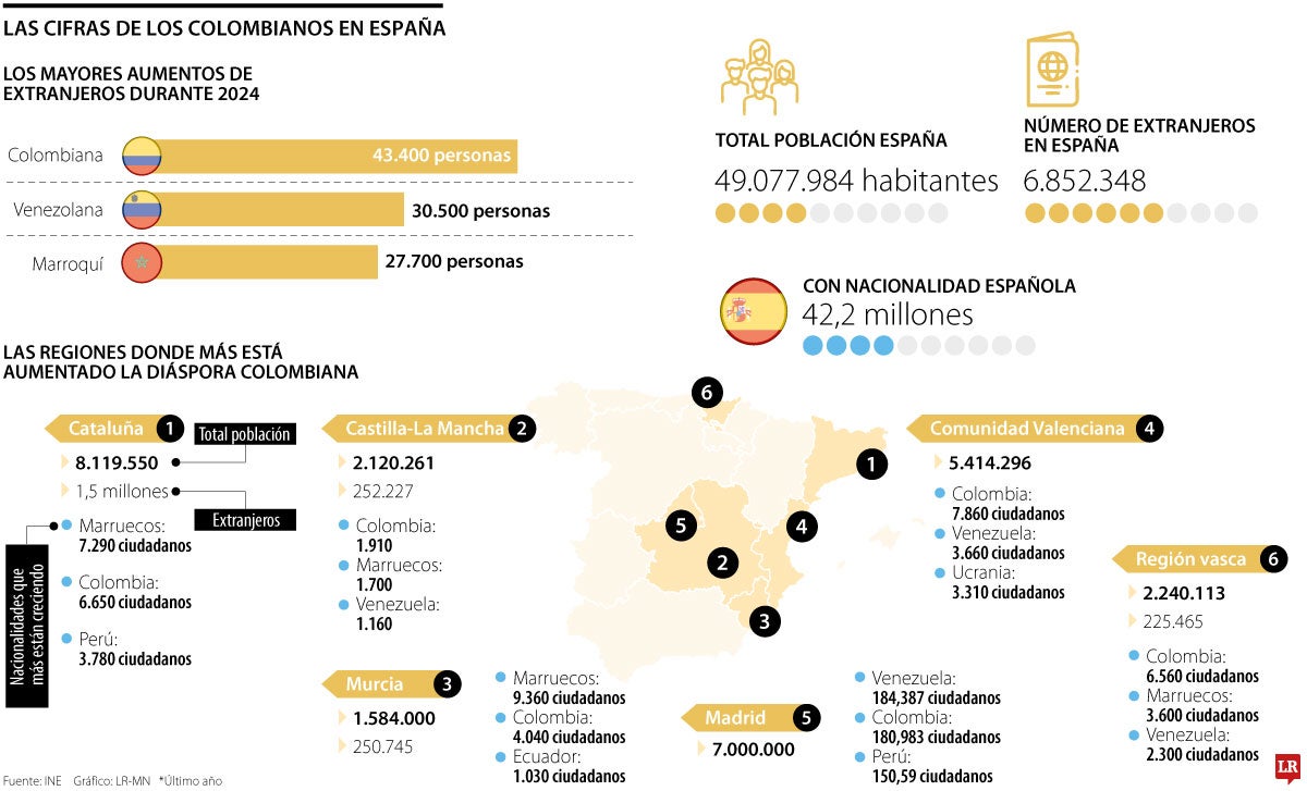 En regiones como Valencia, Castilla-La Mancha y la Vasca, los colombianos fueron la población que más creció durante el año pasado. Por ejemplo, en la comunidad valenciana, llegaron en 2024 7.860 personas provenientes de Colombia, mientras esa cifra en el País Vasco fue de 6.560 y de 1.910 en Castilla-La Mancha.