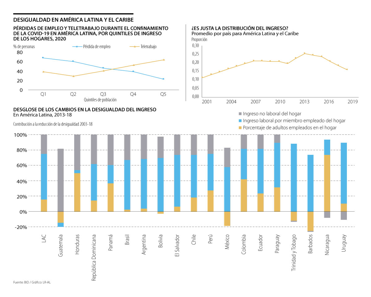 En cuanto al histórico de desigualdad en América Latina y el Caribe, el BID se enfocó en las cifras del coeficiente de Gini, un medidor de desigualdad salarial, que mostraban una disminución transitoria desde 1990 hasta 2018, que pasó de 0,53 a 0,2 en ese periodo.