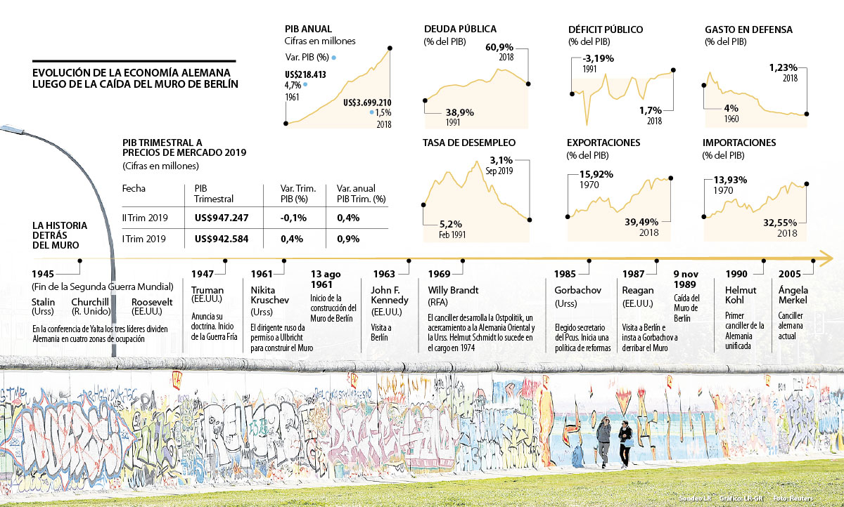 Pero más allá de la connotación política, el muro también tiene un análisis y contexto económico. El PIB anual en 1961 era de US$218.413 millones y para 2018 cerró en US$3,7 billones, lo que significa un crecimiento de 214% en las tres últimas décadas. Si bien esto es un crecimiento significativo, Alemania, que hoy es la economía más grande de Europa, está prácticamente estancada, pues según las últimas cifras de la Comisión Europea, la proyección de aumento del PIB alemán es de apenas 0,4%. Esto quiere decir que es la economía más débil de la Zona Euro, solo después de Italia con una proyección de crecimiento de 0,1%.