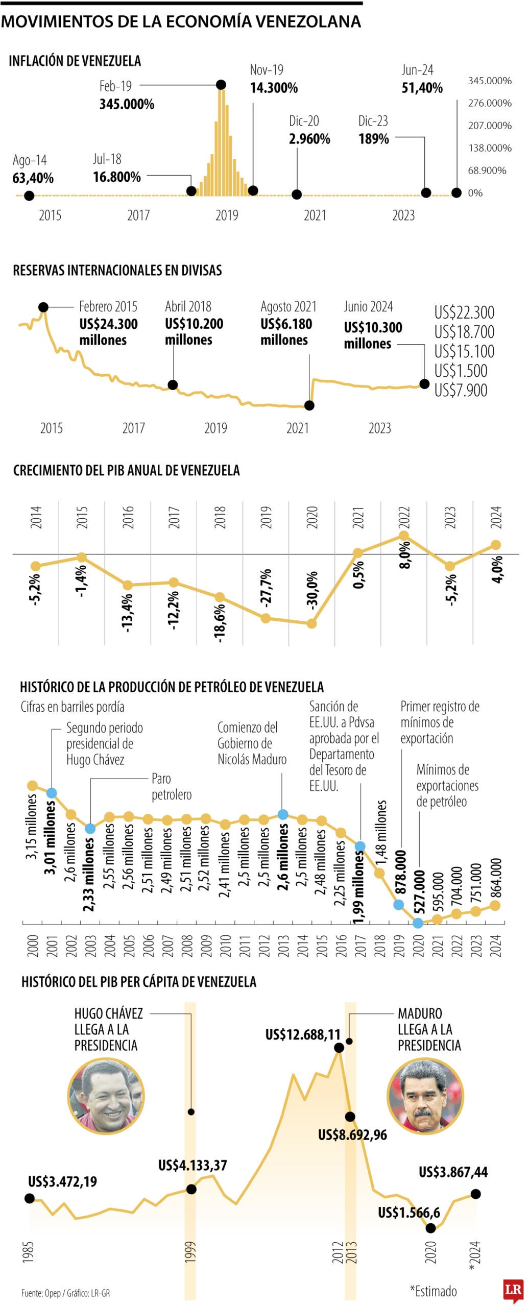 Pero un nuevo periodo de Gobierno le mete presión a la falta de caja que está ganando el país, producto del sobreendeudamiento que debe cumplir, la estrepitosa caída de la producción petrolera (de cada US$100 que ingresan a las arcas públicas US$87 son del petróleo), la presión de la inflación, y próximamente, nuevas sanciones que llegarán de Estados Unidos (quien prometió reforzarlas si no se cumplían unas elecciones transparentes).