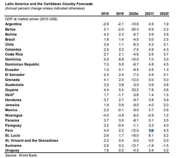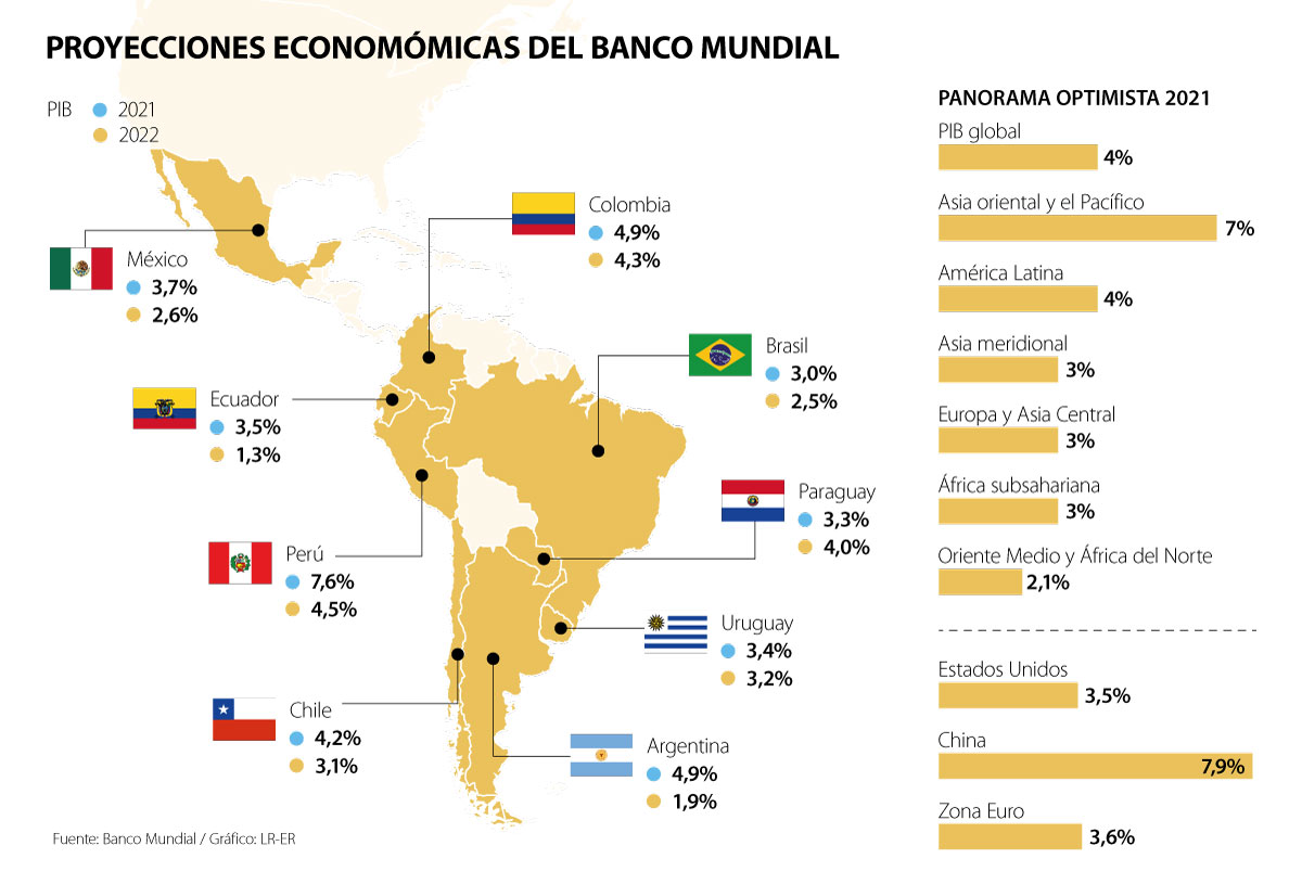 Para 2021, BM prevé un crecimiento de 3,7% en 2021, que dependerá de una flexibilización en las restricciones de movilidad, distribución rápida de las vacunas, la estabilización de los productos básicos y una mejora en las condiciones externas. Si esto no ocurre la expansión podría ser de 1,9 %.