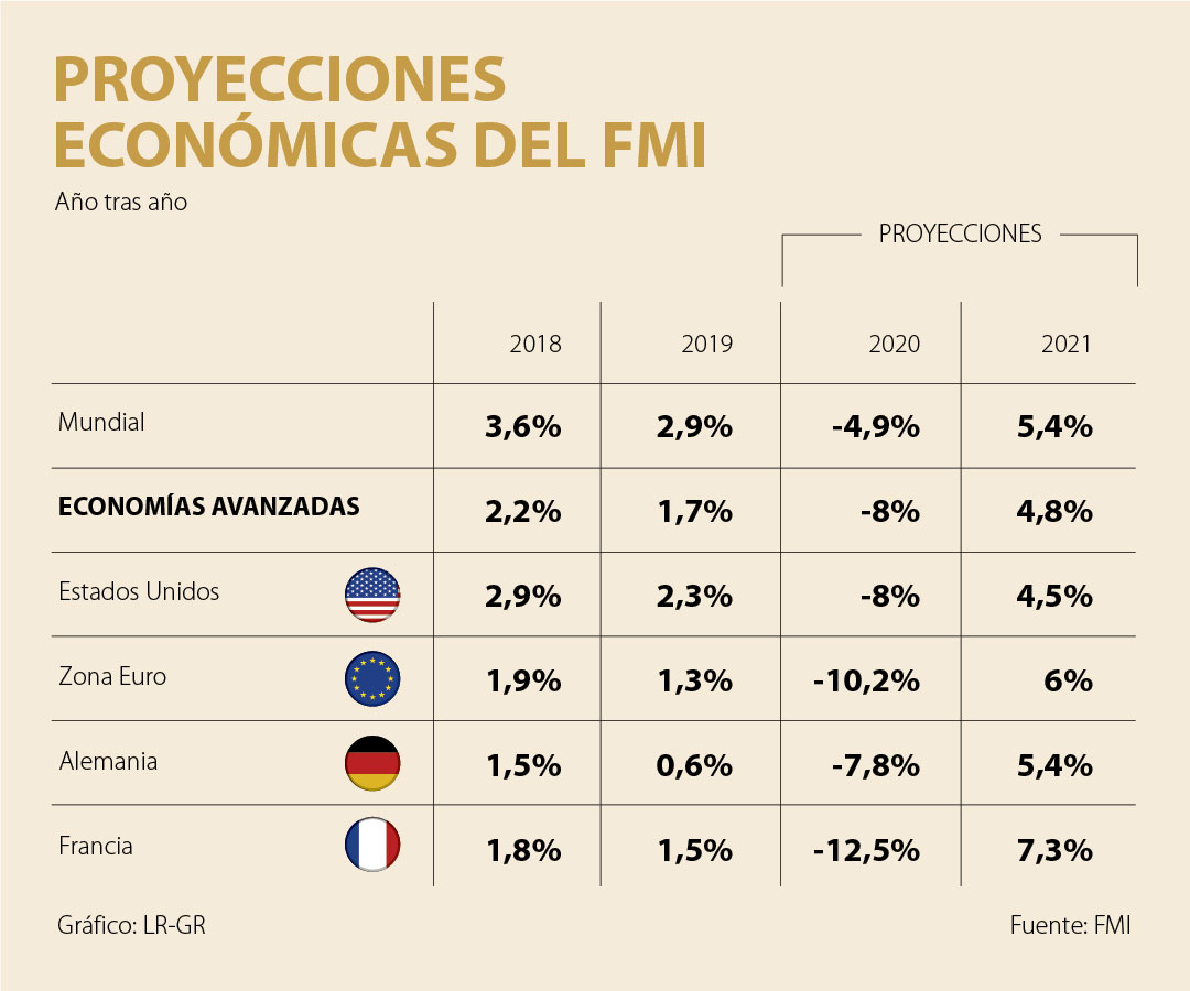 La contracción en la economía se dará de forma generalizada, por lo que el FMI estima que el PIB de las economías avanzadas caerá 8%, el de la Zona Euro, -10,2%; el de América Latina y el Caribe, -9,4%; y el de los mercados emergentes, -3%. Sobre estos pronósticos, el FMI enfatizó en que "al igual que con las proyecciones WEO de abril de 2020, existe un grado de incertidumbre más alto de lo habitual en torno a este pronóstico. La proyección de referencia se basa en supuestos clave sobre las consecuencias de la pandemia".