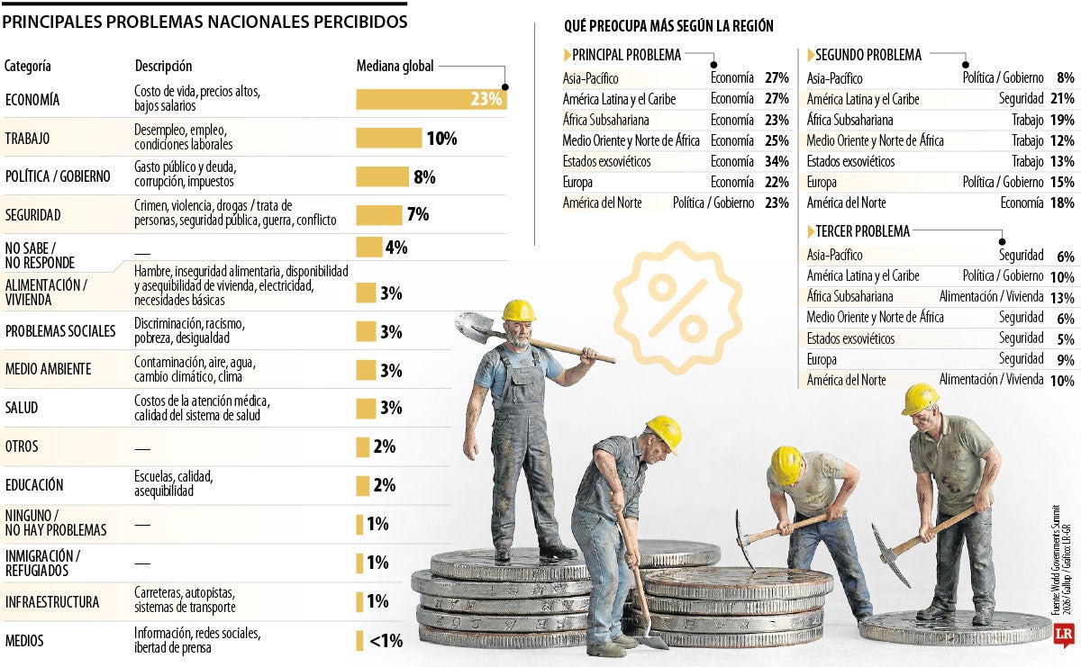 Una encuesta de World Governments Summit y Gallup reveló cuáles son las preocupaciones más inmediatas de la población mundial. La muestra incluyó las respuestas de adultos de 157 países del planeta. A nivel mundial, la economía, el desempleo y la política son la principal fuente de preocupación; en América Latina son la economía, la seguridad y el escenario político.