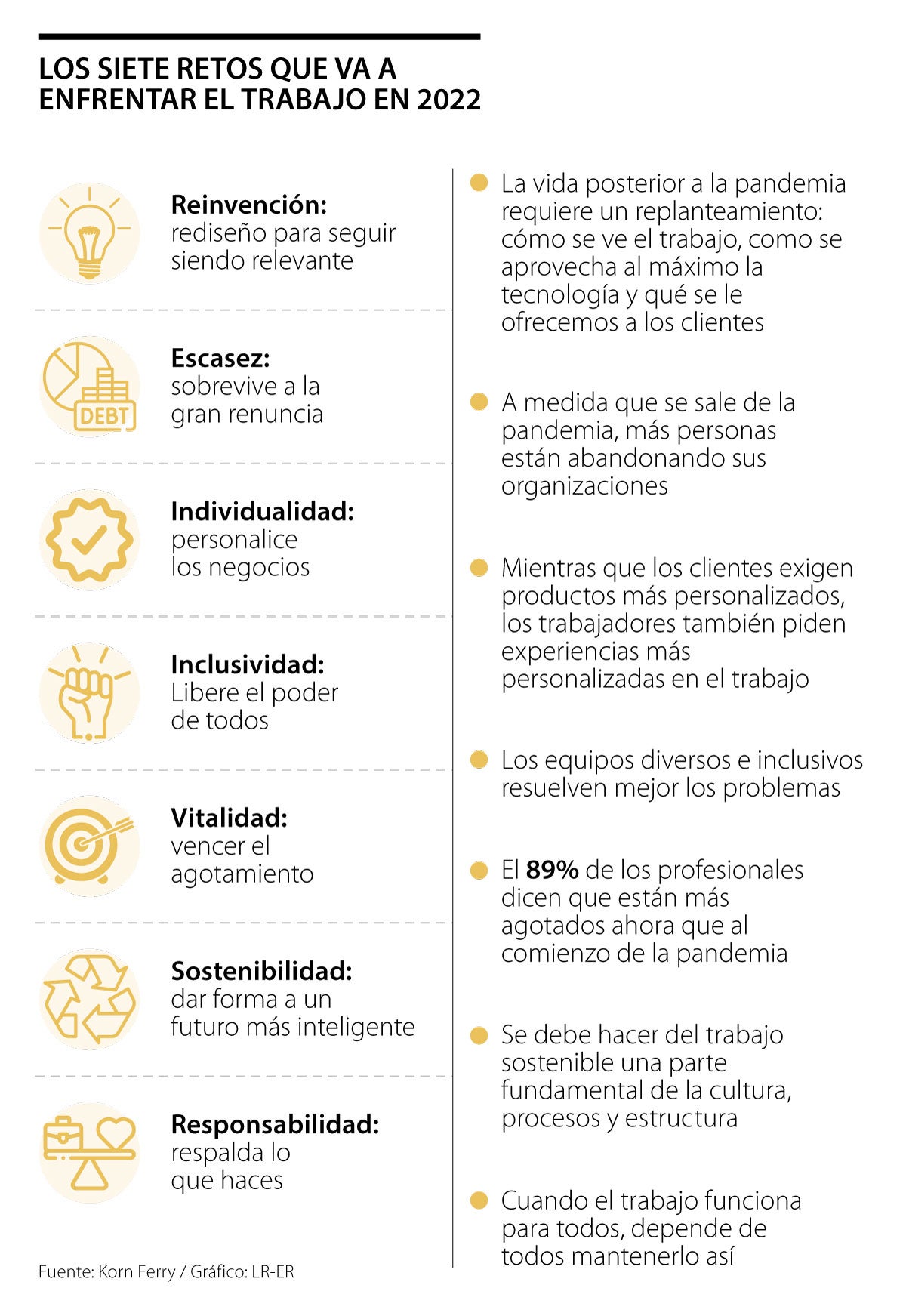 Según la consultora organizacional mundial, Korn Ferry, con la situación de la pandemia casi superada, las empresas dejaron de pensar en esa situación y se enfocaron, con “todos sus esfuerzos”, en establecer cuál será su siguiente paso. Korn Ferry estableció siete tendencias que moldearán la forma en la que funcionará el mundo del trabajo en 2022.