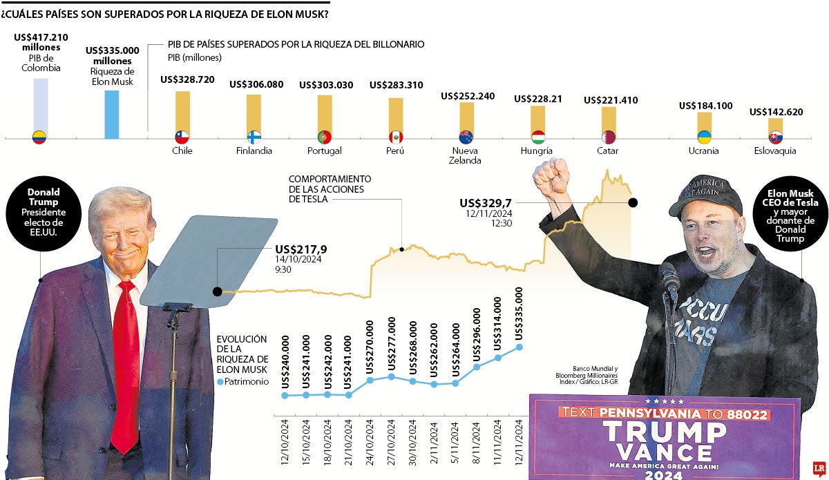 Gracias a este crecimiento, de 26% en un plazo de siete días, y basándose en los registros de PIB del Banco Mundial con corte a noviembre de 2024,el patrimonio de Elon Musk está a US$82.210 millones de ser tanto como el Producto Interno Bruto de Colombia (US$417.210 millones) y a US$68.050 millones de igualar la cifra de su país natal, Sudáfrica, (US$403.050 millones).