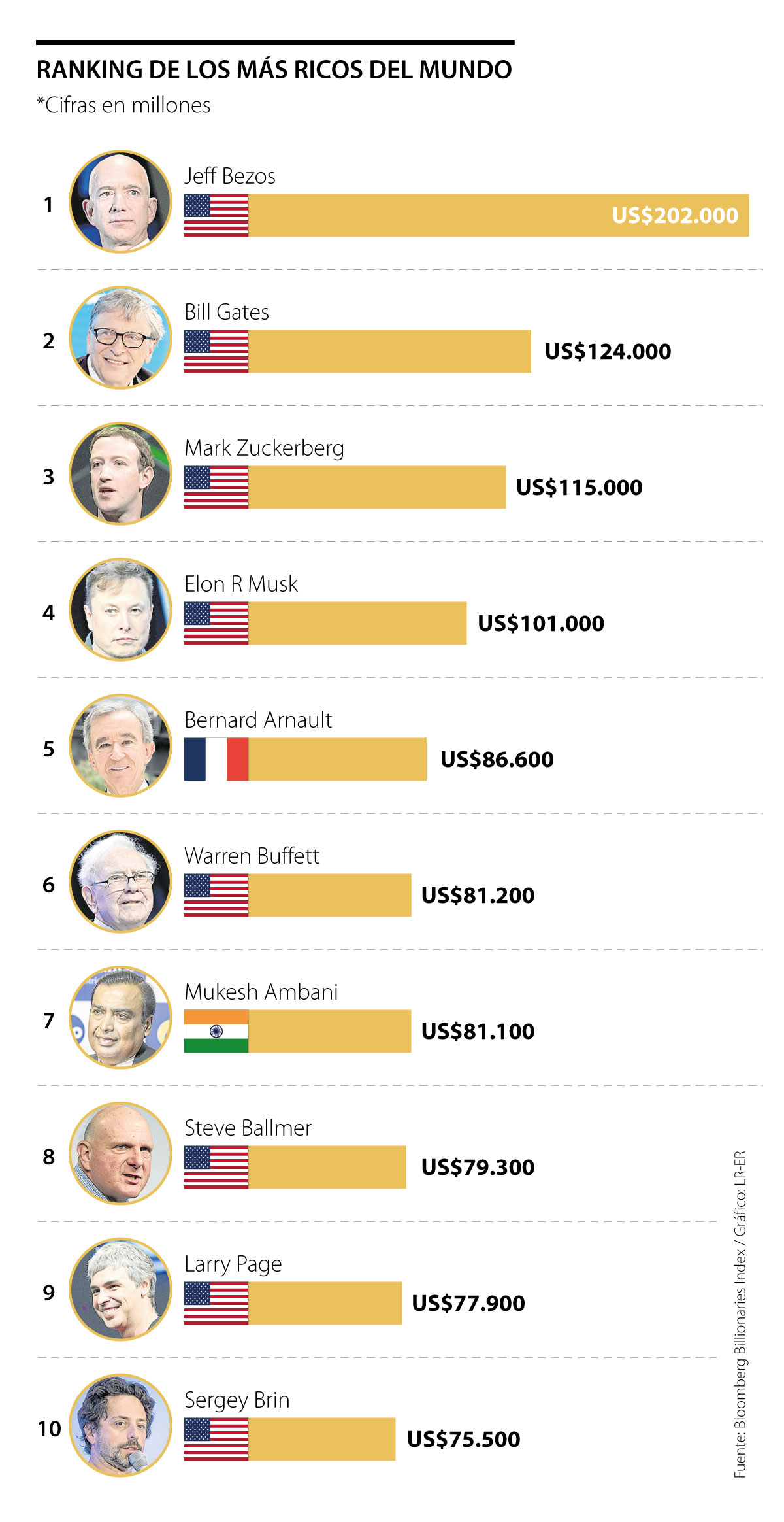 La fortuna del empresario alcanzó los US$202.000 millones. Debajo se ubican Bill Gates con US$124.000 millones y Zuckerberg con US$115.000 millones