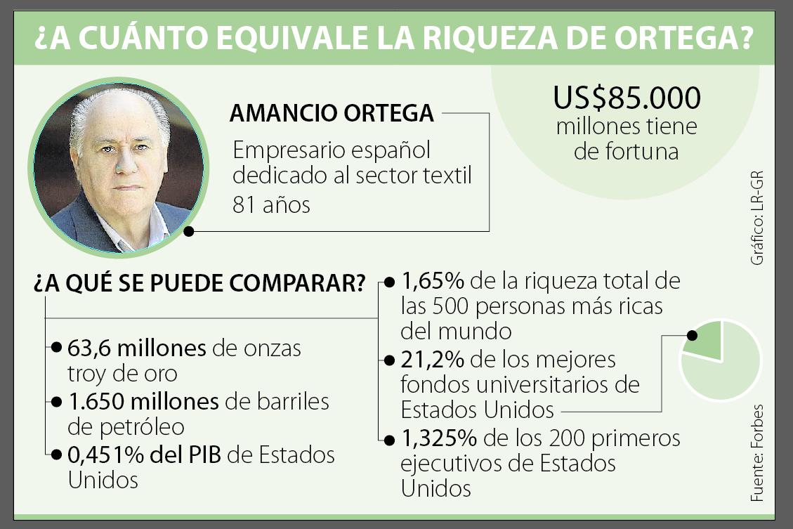 Teniendo en cuenta que el patrimonio de Ortega es de US$85.000 millones, los cálculos de Bloomberg indican que la fortuna representa 0,45% del PIB de Estados Unidos. Además, es igual a 63,6 millones de onzas troy de oro; 1.650 millones de barriles de petróleo crudo y 21,2% de los mejores fondos universitarios de EE.UU.