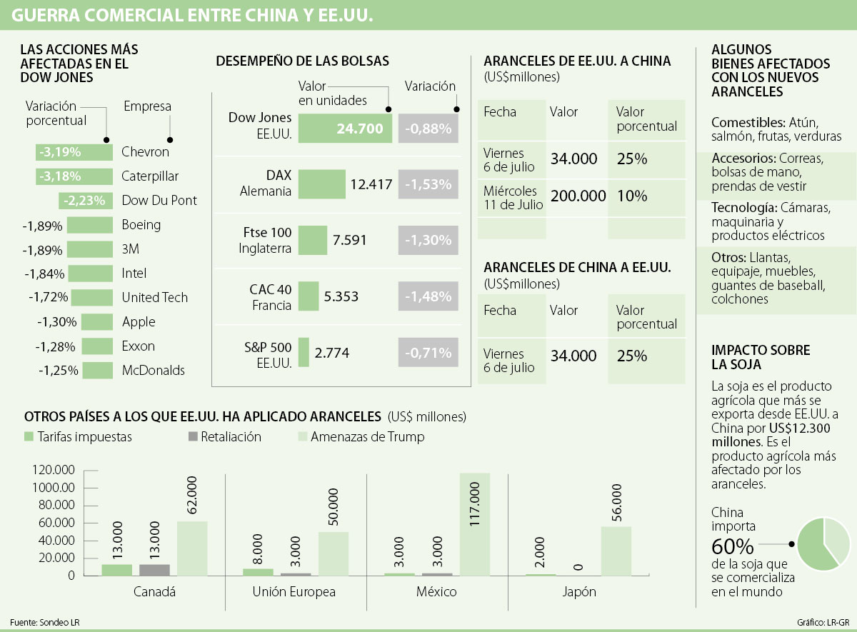 Las tarifas que estudia ahora el gobierno estadounidense se suman a los aranceles de 25% que Trump aplicó sobre China el viernes pasado por un valor de US$34.000 millones a más de 800 productos, a lo que China replicó con tarifas equivalentes.