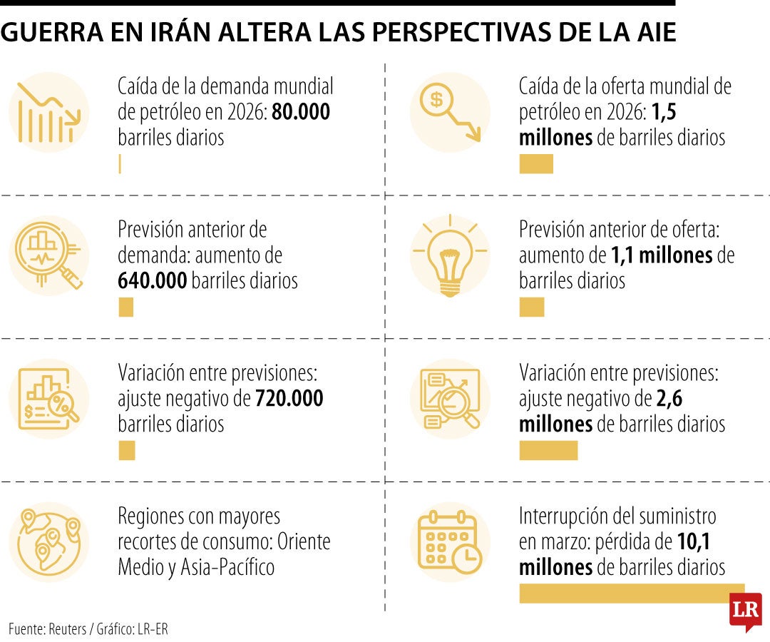 La Agencia Internacional de la Energía (AIE) ha recortado drásticamente sus previsiones sobre el crecimiento de la oferta y la demanda mundiales de petróleo, y señala que ahora se espera que ambas caigan con respecto a los niveles de 2025, en un momento en que la guerra en Oriente Medio interrumpe los flujos de petróleo y lastra la economía mundial.