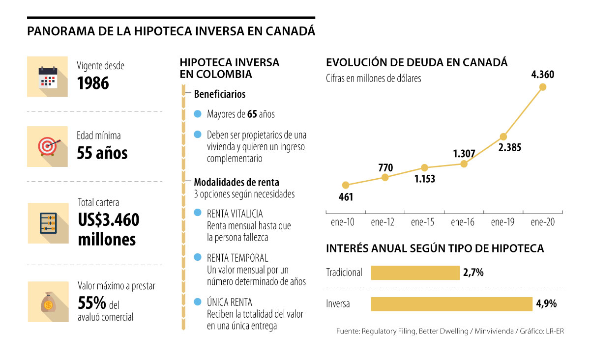 La hipoteca inversa funciona en Canadá desde 1986. Es ofrecida sólo por dos entidades en el país, y está habilitada para mayores de 55 años, un rango de edad en el que se encuentra uno de cada tres canadienses. La figura es definida como una opción para que el propietario de una vivienda pueda obtener dinero de esta sin tener que venderla, lo que también se conoce como ‘liberación de capital’. El monto máximo del crédito no puede superar 55% del avalúo comercial, por lo que en cualquier caso las personas conservan un porcentaje importante del inmueble.