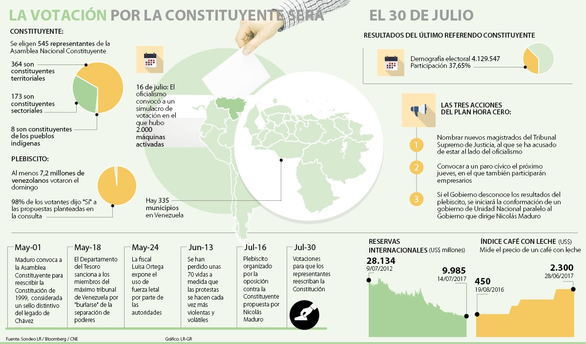 El presidente Nicolás Maduro convocó a una Constituyente para el próximo 30 de julio en la que pretende “reafirmar los valores de la justicia, ganar la paz y aislar a los violentos en una Constituyente para la paz”, “ampliar el sistema económico venezolano para dejar un sistema económico post petrolero” y la “defensa de la soberanía nacional y el rechazo al intervencionismo”, entre otros puntos.