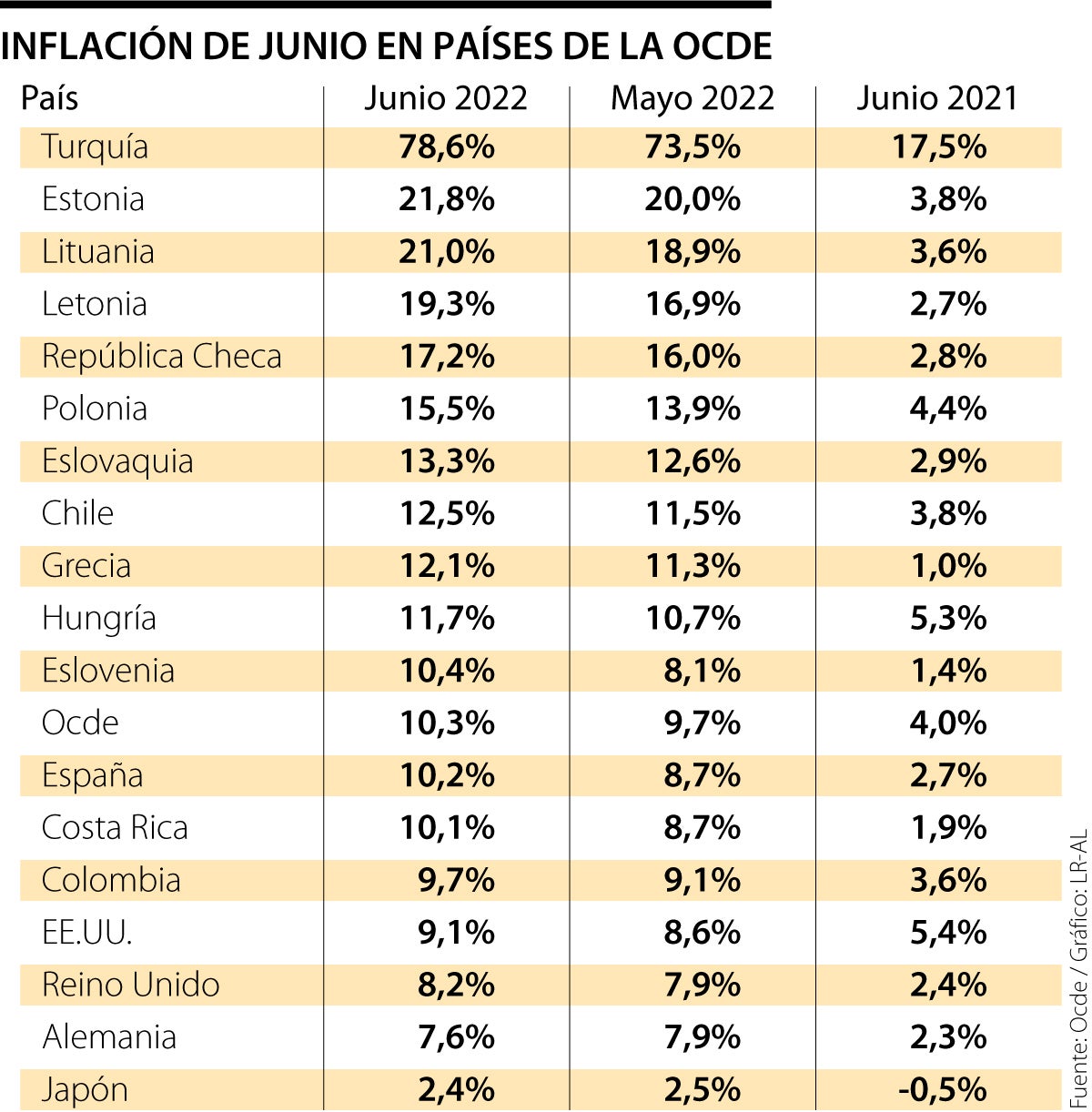 Uno de cada tres países que hacen parte de la Ocde ya tienen una inflación de dos dígitos, con la tasa más alta registrada en Turquía, la cual llegó a 78,6%, aunque este miércoles también se conoció que la inflación turca siguió subiendo en julio hasta 79,6%, la más alta desde la crisis financiera asiática en 1997.