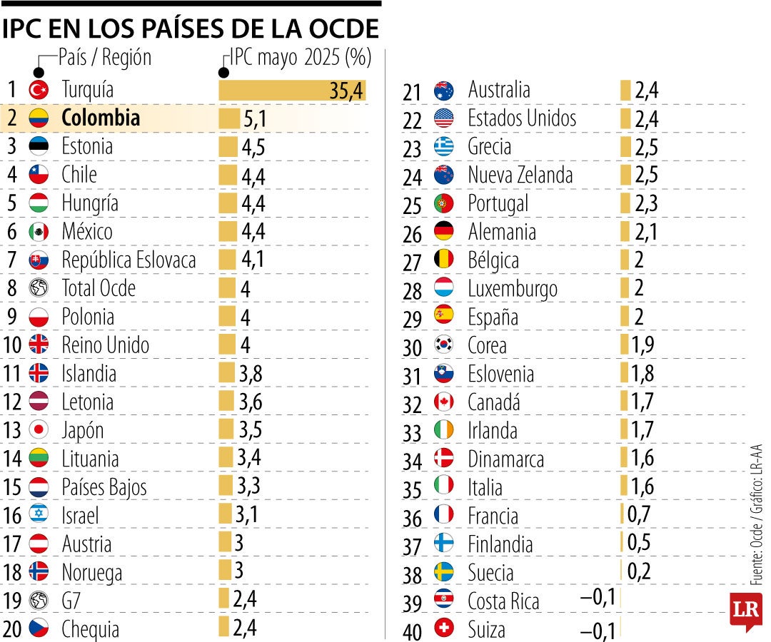 Turquía, Colombia y Estonia reportaron el IPC más alto de 35,4%, 5,1% y 4,5%; Suiza y Costa Rica arrojaron el indicador más bajo