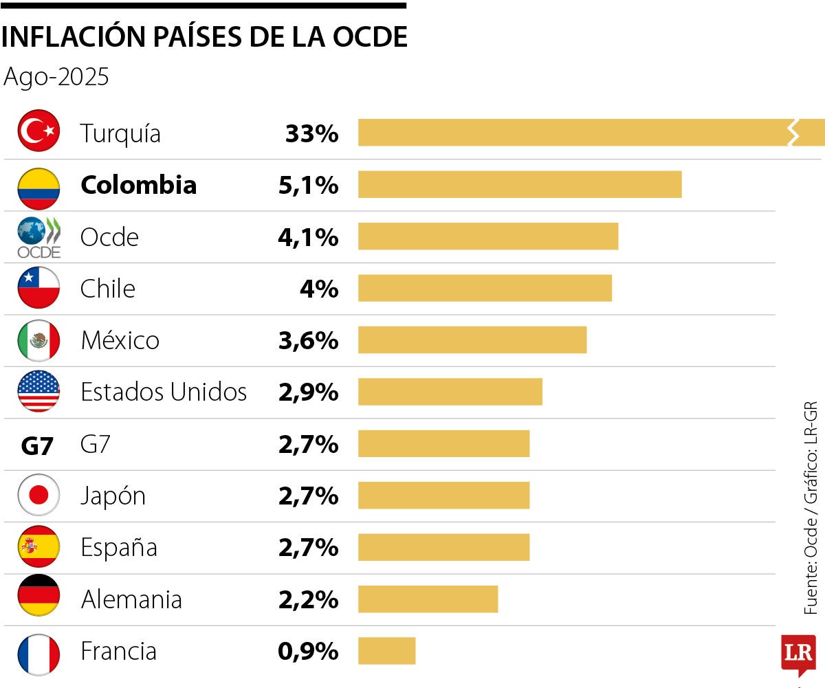 En general, uno de los principales impulsores del alza general de precios fue el costo de alimentos, cuya inflación interanual subió a 5,0% en agosto, frente a 4,5% de julio. Este es el nivel más alto desde febrero de 2024, impulsado principalmente por los aumentos significativos en países como Turquía y Colombia.