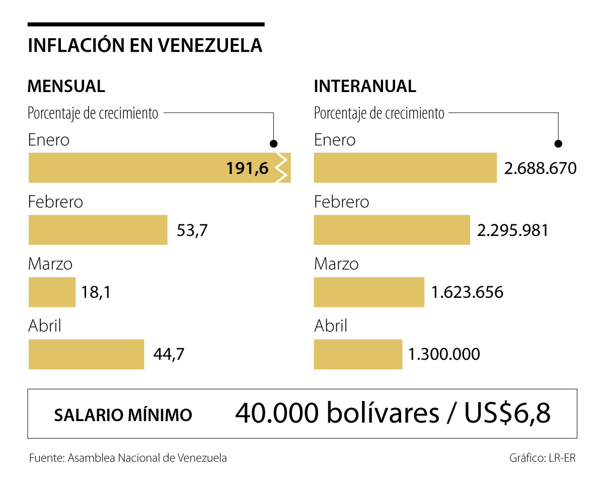 La Asamblea Nacional de Venezuela, controlada por los partidos de oposición al régimen de Nicolás Maduro, dio a conocer el nuevo dato de inflación para abril. Según los cálculos presentados por el Parlamento, la variación del índice de precios interanual fue de 1.300.000%, una cifra que es inferior a la de marzo (1.623.656%), aunque sigue siendo evidentemente muy alta.