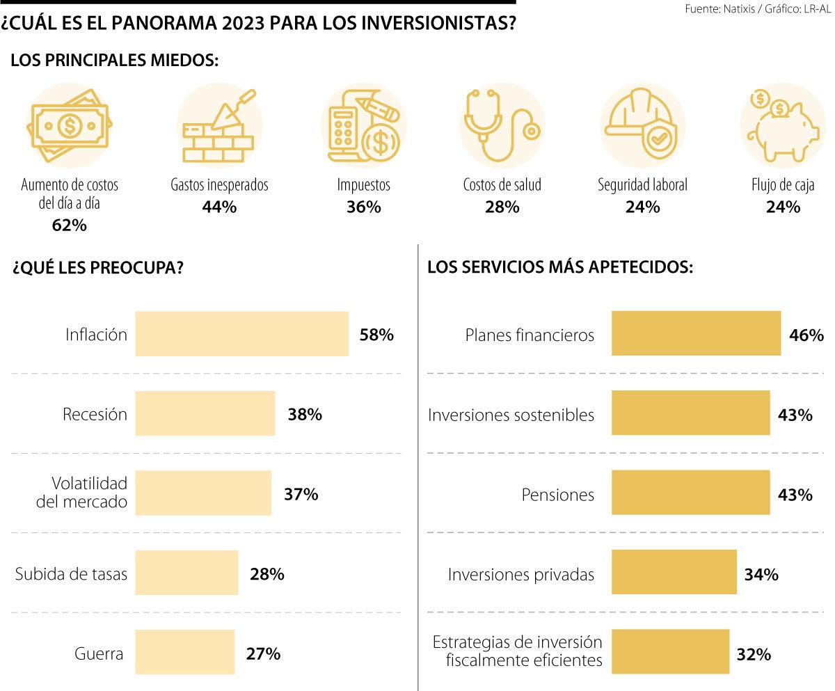 “Frente a un mundo más complicado y un panorama de inversión más desafiante, los inversionistas están empezando a darse cuenta del verdadero valor del asesoramiento profesional y un servicio específico establecido”, dice el estudio. Finalmente, Natixis preguntó sobre el ánimo de los inversionistas para 2023, 30% dijo sentirse seguro, 24% preparado, 22% estresado y 7% deprimido.