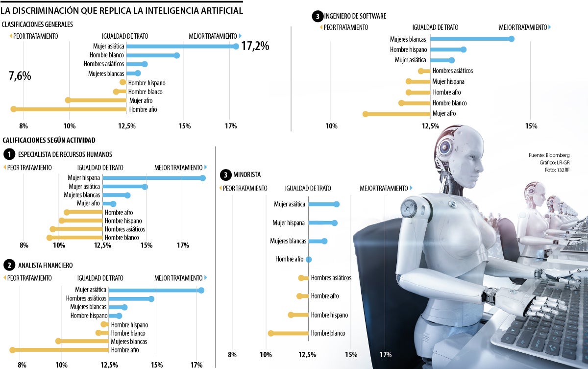 Bloomberg utilizó GPT para generar ocho currículums diferentes y luego los editó para que tuvieran el mismo nivel educativo, años de experiencia y puesto de trabajo. La diferencia clave es el nombre del candidato ficticio y si está asociado estadísticamente con hombres o mujeres afro, blancos, hispanos o asiáticos.