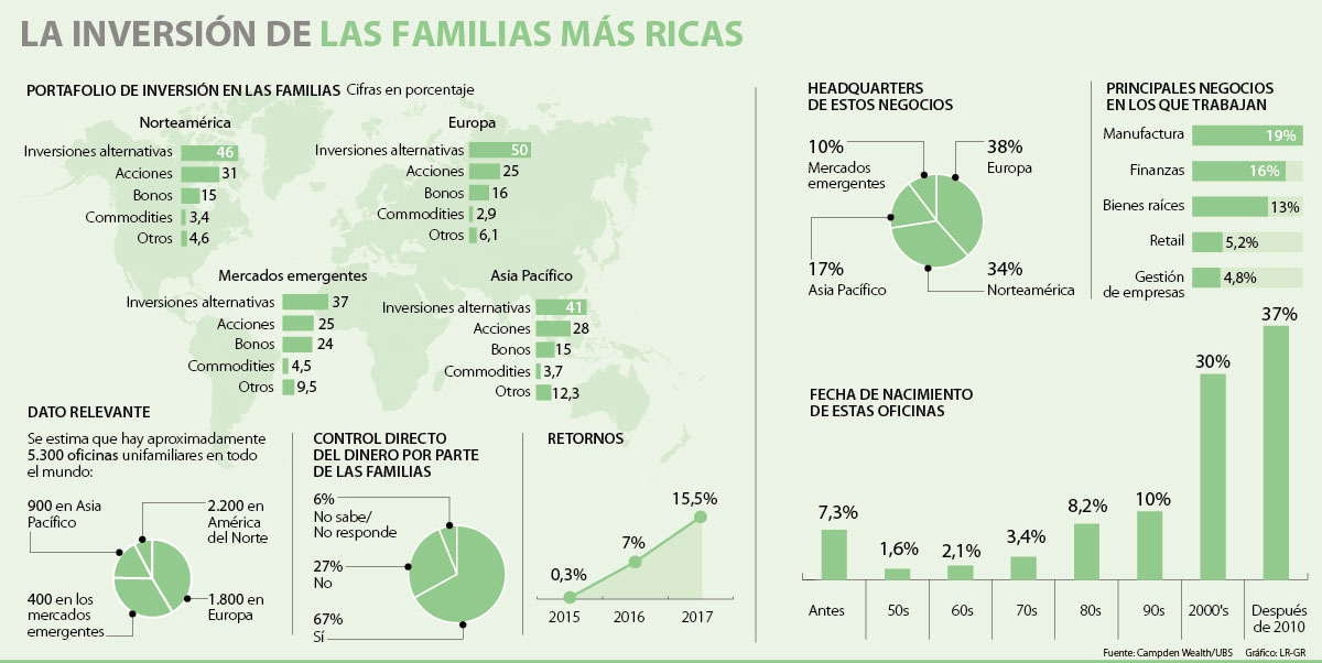 No hay una fórmula única para que los millonarios gestionen su fortuna, pero sí existen conductas en común que contribuyen de alguna manera a incrementar su capital, y eso se lo deben principalmente a las empresas encargadas de cuidar su patrimonio. Según el Global Family Office Report 2018 de Campden Wealth y UBS, el retorno de la inversión de las familias más acaudaladas se duplicó y 46% de sus negocios están relacionados con “inversiones alternativas”, que incluyen fondos de capital privado y bienes inmuebles, entre otros.