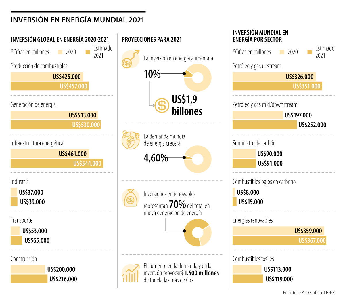 Así las cosas, según las proyecciones para 2021, el liderato en inversiones lo tendrá el rubro de infraestructura energética, con una financiación de US$544.000 millones.