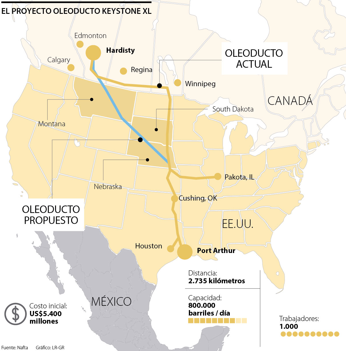 La construcción del Oleoducto Keystone XL permitiría transportar 800.000 barriles de petróleo en un recorrido de 2.735 kilómetros, desde la provincia de Alberta, en Canadá, hasta la costa del Golfo de Texas, pasando por Montana, Dakota del Sur, Nebraska, Kansas y Oklahoma, en los Estados Unidos.