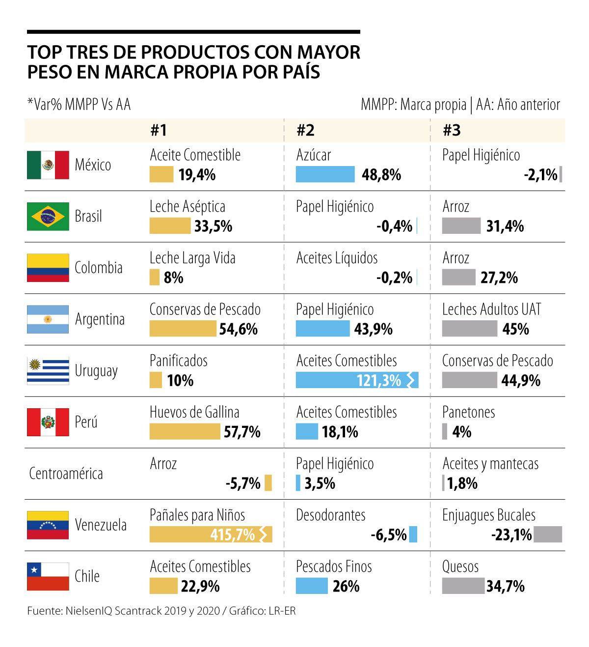 Vale la pena destacar que dentro del top de productos con más peso en las marcas blancas en 2020 para Latinoamérica también están el papel higiénico en México, Brasil, Argentina y Centroamérica; así como los desodorantes, enjuagues bucales y pañales para niños en Venezuela.